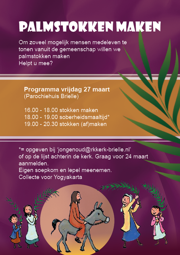 Wilt u een palmpaasstok maken, samen met uw (klein-)kind of alleen, dan bent u van harte welkom op vrijdagmiddag 27 maart om 16:00 uur in het parochiehuis (Nobelstraat 22, Brielle).